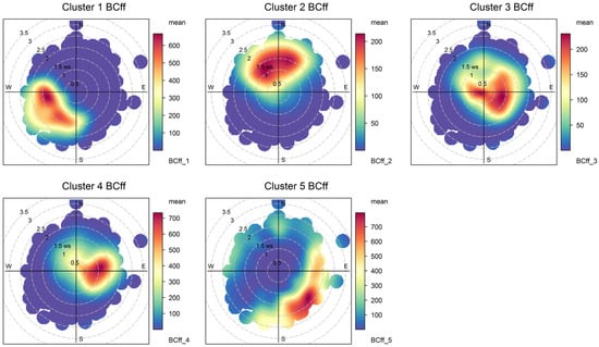 Hence, for simplicity’s sake, we chose the lowest number of fuzzy clusters (5) that apportion all major BCff sources at play. Figure 5 and Figure 6 display the temporal and spatial variability of those clusters, respectively, and Table 4 provides a statistical summary of cluster contributions; additional bivariate plots for BCff are presented in Appendix B (Figure A4 and Figure A5). Below we discuss the features of this five-cluster solution.