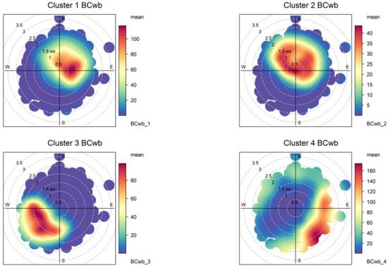 Cluster 1 contributions rise in the daylight hours and are zero overnight; these contributions increase in the austral summer season and decrease over weekends. Since they come from W/SW directions, this fuzzy cluster is identified as Santiago’s urban plume reaching the monitoring site as anabatic winds develop during daylight. Contributions of this source are highest when temperatures and wind speed increase in the summer season; this air quality feature of the eastern side of Santiago has been described before [36,46]. On average, this source contributes 14% of the total BCff. Notice that in Table 4, this contribution has more than 25% of hours with zero contribution, which corresponds to overnight conditions.