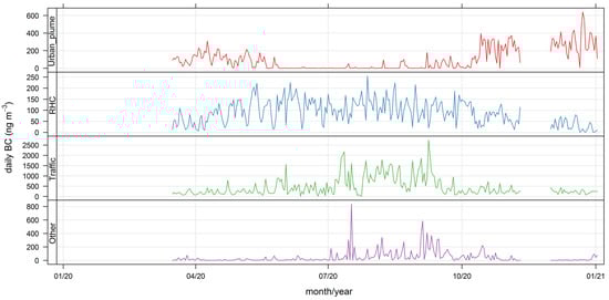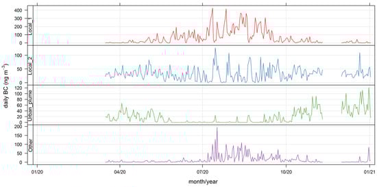 Figure 9 and Figure 10 show the daily source contributions for BCff and BCwb, respectively. Local traffic contributions dominate BCff, and local wood-burning sources dominate BCwb. Nonetheless, the noisy source contributions have the largest hourly spikes (Figure A8 and Figure A9). Notice that the urban plume contributions are minimum in wintertime when the mixing layer over the city reaches minimum values [47], blocking air masses from arriving at the monitoring site. The urban plume contribution shows a rise towards the end of 2020, associated with less stringent lockdowns therein and a consequent increase in traffic activity levels [33].