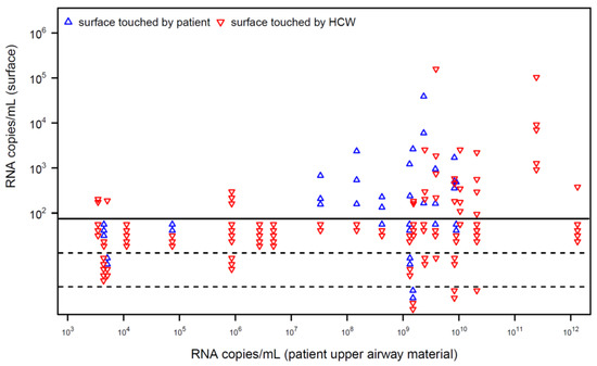 Viral RNA in the immediate patient environment. The number of detectable copies of viral RNA is shown for surfaces in the immediate patient environment. The viral burden on near-patient surfaces in intensive care units was examined on surfaces touched by spontaneously breathing patients (blue triangles) and surfaces used by health care workers (HCW; red triangles) and correlated with the RNA load detectable in the upper airways of the respective patients (nasopharyngeal swab or tracheal secretion) from the same day or with a maximum time interval of one day. Triangles below the solid line represent PCR results below the detection limit. Dashed lines separate the results of different patients with comparable RNA loads in the upper airways.