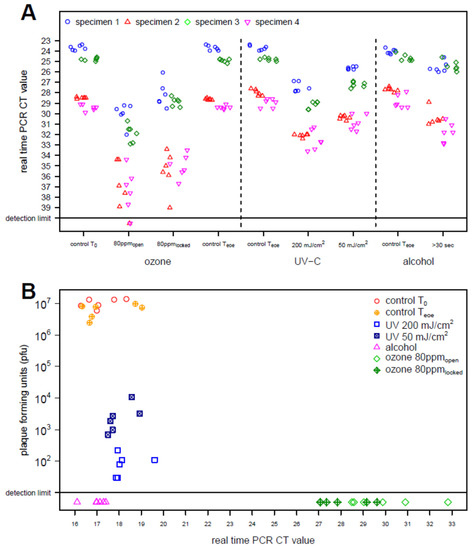 For the comparison of infectivity and Ct value, ceramic tiles were contaminated with the enveloped bacteriophage Φ6 as a surrogate virus of SARS-CoV-2. Phage Φ6 (DSM 21518) and the bacterial host strain P. syringae pv. syringae (DSM 21482) were purchased from Leibniz-Institute DSMZ—Deutsche Sammlung von Mikroorganismen und Zellkulturen GmbH (Braunschweig, Germany). Initial lysate of Φ6 with a titer of 4 × 1011 plaque-forming units (pfu)/mL was produced using a top agar overlay technique. Then, 20 µL of a 1:10 dilution was deposited onto ceramic tiles resulting in an initial concentration of >107 pfu/mL on each carrier. After each decontamination process, Φ6 from both treated and untreated carriers was recovered by rinsing off the surface with 1ml Tryptic Soy Broth (TSB) + 5 mM CaCl2 medium 15 times and transferred to a reaction tube. For direct quantification of viral concentration, a plaque assay was performed. Tenfold serial dilutions of the rinsing fluid (100 µL) were mixed with a fresh culture of the host strain as well as 4 mL soft agar with subsequent transfer on Tryptic Soy Agar (TSA) + 5 mM CaCl2 culture media. Plates were incubated at 23 °C for 24 h. Finally, plaque-forming units were determined and reduction factors were decided.