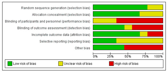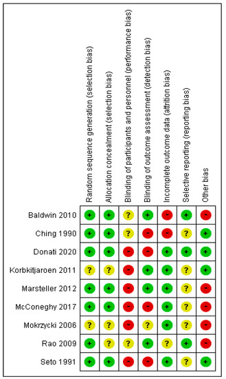 - Sterne, J.A.C.; Savovic, J.; Page, M.J.; Elbers, R.G.; Blencowe, N.S.; Boutron, I.; Cates, C.J.; Cheng, H.Y.; Corbett, M.S.; Eldridge, S.M.; et al. RoB 2: A revised tool for assessing risk of bias in randomised trials. BMJ 2019, 366, l4898. [Google Scholar] [CrossRef] [PubMed]