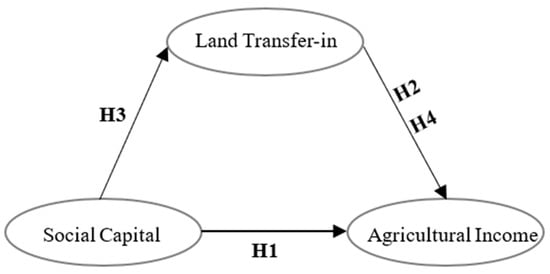 The role of social capital in all aspects of agricultural production is similar. The process of land transfer for agricultural income generation involves reduced transaction costs, the access to lease capital and information, risk sharing and cooperation mechanisms in the establishment of long-term land transfer behavior, and the input of urban production factors, all carried out under a network of rural social interactions. Therefore, rural social capital can effectively promote farmers’ land “transfer in” behavior, which, in turn, promotes agricultural income growth. Thus, land transfer plays an intermediary role in the process of social capital promoting the growth of farmers’ income and is one of the mechanisms through which social capital directly affects farmers’ agricultural income. Accordingly, research Hypothesis 3 was formulated:
