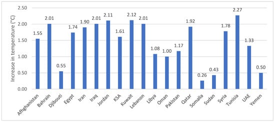 Increase in temperatures in various countries of the EMR between 1901 and 2021. Data retrieved from the World Bank Climate Change Knowledge Portal [21,22,23,24,25,26,27,28,29,30,31,32,33,34,35,36,37,38,39,40]. Abbreviations: EMR: Eastern Mediterranean Region; KSA: Kingdom of Saudi Arabia; UAE: United Arab Emirates.