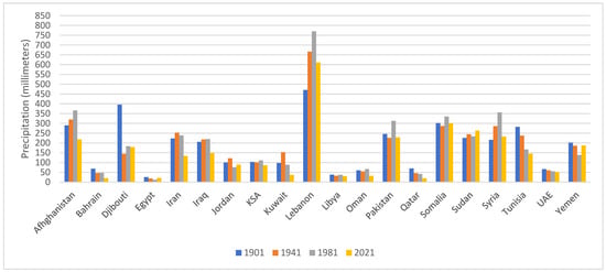 Trend in annual precipitation (millimeters/year) in various countries of the EMR. Data retrieved from the World Bank Climate Change Knowledge Portal [21,22,23,24,25,26,27,28,29,30,31,32,33,34,35,36,37,38,39,40]. Abbreviations: EMR: Eastern Mediterranean Region; KSA: Kingdom of Saudi Arabia; UAE: United Arab Emirates.