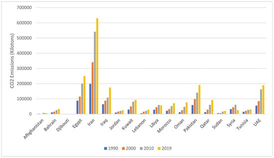 As shown in Figure 3, and similar to observations from other parts of the world [57,58,59,60], CO2 concentrations/emissions have been following an increasing trend over time in the EMR. Iran has the highest level of CO2 emissions in the region, reaching 630,010 kilotons in 2019. The relative increases in CO2 emissions (calculated as (2019 levels/1990 levels) × 100) ranged between +79% in Syria and +733% in Qatar, with a regional average of 327%.