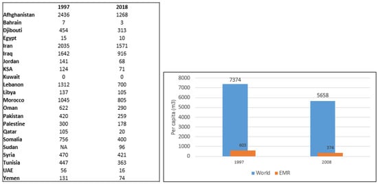 Some models anticipate that by 2025, between 80 and 90 million people in the region will experience some sort of water stress [14,84,85], particularly in low-lying coastal parts of the EMR, where decreasing levels of precipitation and the inability of countries to replenish internal fresh water supplies (rivers and aquifers) are coupled with rising sea levels due to climate change [11,14,86]. Data on per capita levels of renewable internal freshwater resources are shown in Figure 4 for the years 1997 and 2018. Importantly, compared to the world’s per capita levels of renewable internal freshwater resources, which have decreased from 7374 m3 in 1997 to 5658 m3 in 2018 (i.e., percent change of −23%), the decrease in per capita renewable internal freshwater resources was sharper in the EMR, estimated at −38% (from 603 m3 in 1997 to 374 m3 in 2018).