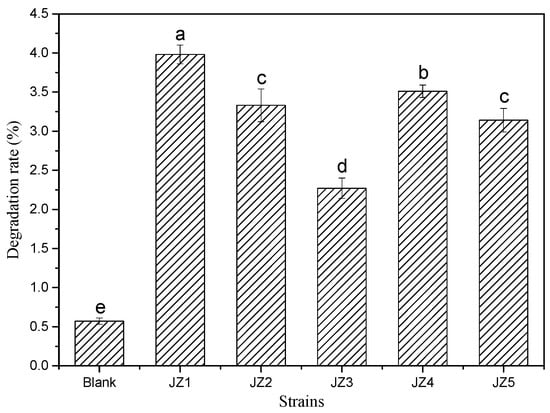 Degradation rate of PBAT film by strains in basic salt + 1% tryptone medium; a–e are symbols indicating the significance of the difference.
