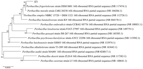 PCR amplification was carried out with universal primers of bacteria, and the amplified products were sequenced by using the genomic DNA of strain JZ1 as the template. The obtained 16S rRNA gene sequence length was 1201 bp after splicing. The 16S rDNA sequence of strain JZ1 was registered in the ribosomal database (NR117474.1), and Blast similarity analysis was carried out with the sequence in the NCBI database. It was found that the nucleotide sequence homology of strain JZ1 and Peribacillus frigoritolerans strain LPB69 was 99.4%. The phylogenetic tree was constructed by selecting 10 16Sr RNA gene sequences with high similarity and using MEGA6.0 software and the neighbor-joining method, as shown in Figure 2.