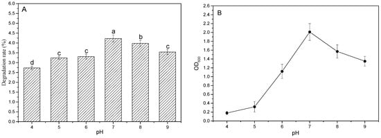 Figure 4 shows the impact of different pH values on the PBAT film degradation rate and the change of biomass in the basic salt + 1.5% tryptone medium. As shown in Figure 4A, the degradation rate of the biodegradable plastic film shows a trend of increasing first and then decreasing with the increase of pH value. The degradation rate of the PBAT film was only 2.73% when the pH value was 4 and reached its peak of 4.21% when the pH became neutral (7.0), which was significantly higher than the values in other acid–alkaline culture conditions (p < 0.05). This changing of the trend of the film degradation rate is consistent with the OD600 changes in different pH values (Figure 4B). OD600 was only 0.18 when the pH was 4, and increased dramatically to 2.01 when the culture medium became neutral, then slowly decreased to 1.35 when the pH further increased to 9.0. The similar changing trend between the biomass and the degradation rate of the PBAT film indicates that the strain grows best under neutral conditions and is directly related to the degradation of PBAT film.