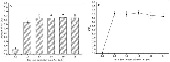 Figure 5 shows the impact of different inoculum amounts on the PBAT film degradation rate and the change of biomass in the basic salt + 1.5% tryptone medium. As shown in Figure 5A, there was only 0.53% of PBAT film loss in the blank medium (without inoculation of the strain JZ1). The degradation rates significantly increased to 3.76% and 4.27% with the addition of 0.5 mL and 1.0 mL inoculum, and stabilized at this level with further increases in the inoculum amount (1.5–2.5 mL). Figure 5B shows that OD600 was only 0.07 in the blank medium and increased sharply to 2.01 (with 0.5 mL inoculum) and kept at this level until the inoculation amount increased to 1.5 mL before slightly decreasing to 1.92 and 1.87 (p > 0.05) when the inoculum amount further increased to 2.0 mL and 2.5 mL. Therefore, the inoculum amount of 1.0 mL was chosen in this study.