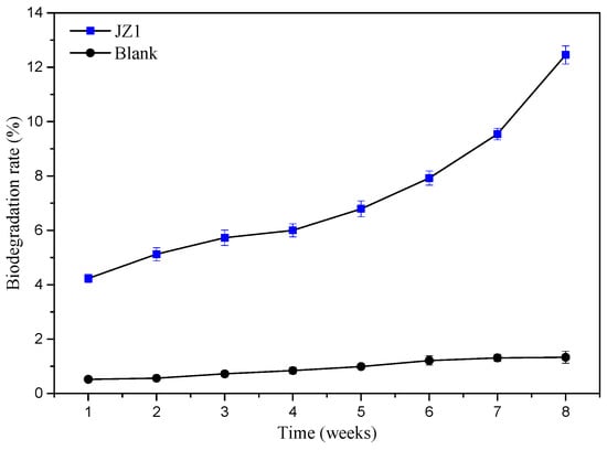 The trend of PBAT film degradation rate with and without inoculation of JZ1 over a period of 8 weeks.