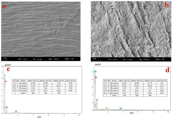 SEM images and EDX spectra of the PBAT film before and after the 8 weeks degradation by strain Peribacillus frigoritolerans S2313; (a) SEM image before the degradation; (b) SEM image after the 8 weeks degradation; (c) EDX spectra before the degradation; (d) EDX spectra after the degradation. Typical images and spectra are shown from one of the triplicate examinations.