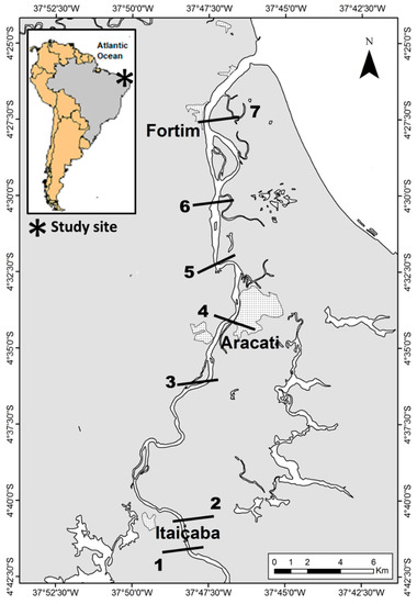 Map showing municipalities and the location of sampling stations along the Jaguaribe River Estuary in northeast Brazil. 1. Upstream Itaiçaba. 2. Downstream Itaiçaba. 3. Cabreiro. 4. Aracati City. 5. Vila Volta. 6. Jardim. 7. Fortim City. Sampling stations were chosen according to river sections defined based on major physical–chemical variables by Dias et al. [7,32,33,34].