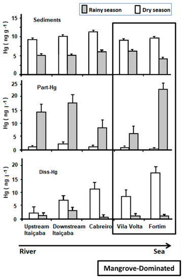 Higher Diss-Hg and lower Part-Hg concentrations in dry periods relative to rainy periods have been reported in many estuaries, mostly in regions with sharp differences in rainfall and, therefore, in river flow, between seasons, e.g., Coulibaly et al. [51] in Biétri Bay, Ivory Coast, higher mercury concentrations were recorded during the dry season, Saniewska et al. [12] in the Arctic coast, Cardoso et al. [52] in Ria do Aveiro, southern Portugal, Azevedo et al. [13] in the Rio Paraíba do Sul estuary on the dry coast of northern Rio de Janeiro. In China, the overuse of water resources in the middle and higher reaches of several rivers results in less and less water flowing into estuaries. Consequently, some recent studies have also observed increasing seasonal differences in Hg partitioning along Chinese estuaries due to excess upstream water withdraw (Tong et al. [26], Jiang et al. [53]). Therefore, increasing mobilization and bioavailability of Hg in estuaries has been highlighted as a ubiquitous, environmentally significant response to increased drought because of water resource overuse, reduced annual rainfall and increased frequency and duration of extended droughts caused by global climate change [6].