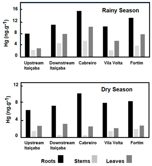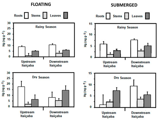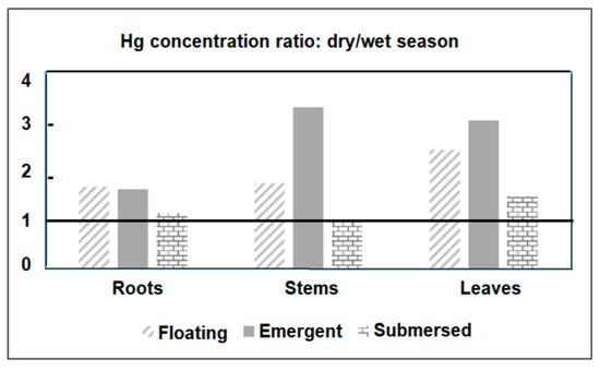 Figure 4 shows the ratio between Hg concentrations measured in plant tissues from all sampled species in the dry and wet seasons. The seasonal enrichment of Hg that occurred in all tissues and plant habitats was particularly high (>3.0) in the stems and leaves of emergent macrophytes. The seasonal variation in Hg concentrations in plants agrees with the variability of dissolved Hg. In general, floating and submerged macrophytes efficiently uptake Hg through rhizofiltration and further translocate and accumulate it in the other plant tissues. However, translocation rates from roots to other leaves are, in general, smaller than 1.0 [23]. Root/leaf ratios were similar between dry (0.63) and rainy (0.53) seasons, strongly suggesting that seasonal changes in Hg contents are due to changes in environmental levels rather than different seasonal physiological metabolism of the plant. The strong relationship between Hg concentrations in floating plants and water has been the basis for using this organism to clean up contaminated aquatic ecosystems, as reported in other studies [23,54,55].