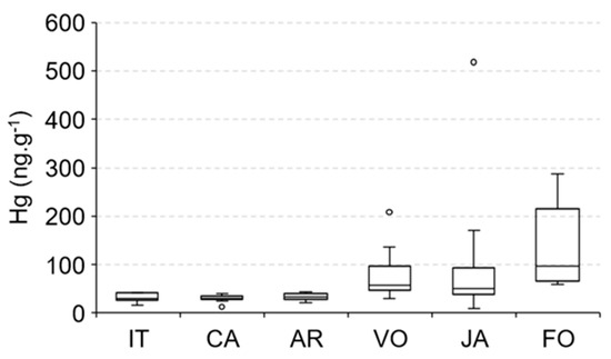 Spatial distribution of Hg concentrations in the fish E. brasilianus along the Jaguaribe River Estuary: IT—Upstream and downstream Itaiçaba, CA—Cabreiro, AR—Aracati City, (fluvial influenced) VO—Vila Volta, JA—Jardim, FO—Fortim City (marine influenced).