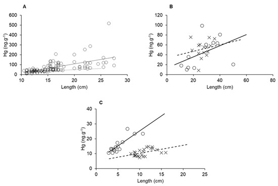 Size and Hg bioaccumulation in E. brasilianus (A), C. spixii (B) and L. vannamei (C) sampled in a fluvial-dominated area (x point, dashed line) and a marine-dominated area (circle point, continuous line).