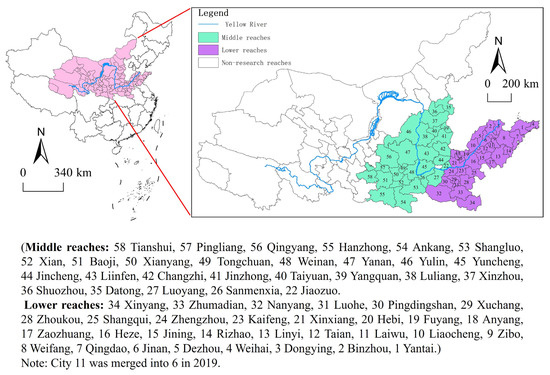 The Yellow River Basin flows through nine provinces, including Qinghai, Sichuan, Gansu, Ningxia, Inner Mongolia, Shanxi, Shaanxi, Henan and Shandong. It is an important ecological security barrier in China and an important region for population activities and economic development. Especially in the middle and lower reaches of the basin, traditional industries with high energy consumption, high emissions and high pollution are clustered, and the air pollution problem urgently needs to be solved. Based on the division standard of the Yellow River Water Conservancy Commission in this study basin area, a total of 57 cities are included as the research object (because of the lack of data on Jiyuan city and Laiwu city in Jinan in 2019, the two cities are not included within the scope of this research) (Figure 1).