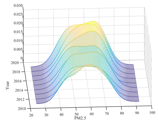 where, is the observed value of variable in city , is the mean value, is the number of observations, is the bandwidth, and is the kernel function. In this study, we selectde the most frequently used Gaussian kernel function to study the dynamic evolution of the digital economy and PM2.5 concentration. The formula of Gaussian kernel function is: