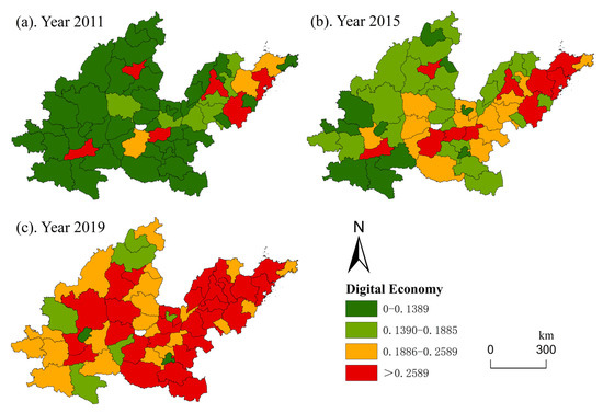 Figure 3 shows the spatial evolutionary characteristics of the digital economy. Over the 9-year study period, the 57 cities showed an overall upward trend in the level of the digital economy, and the digital economy level of most cities was less than 0.1389 in 2011. However, in 2019, the cities with a digital economy level higher than 0.2589 accounted for 49%, and the number of cities with a digital economy level below 0.1389 was only two, Luohe and Tongchuan. The highest level of the digital economy by region was found in the lower reaches of the Yellow River Basin, especially Jinan, Qingdao, Yantai and Linyi in Shandong Province. In addition, some provincial capitals, including Zhengzhou, Taiyuan, and Xi’an, developed rapidly in terms of their digital economy level.