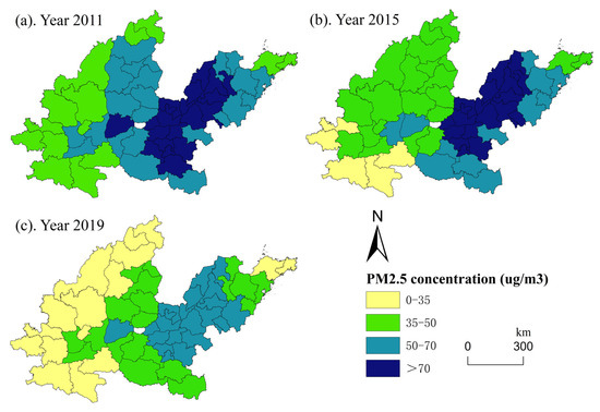 The time scale of this study is 8 years. To better show the spatial evolution characteristics of the digital economy and the Yellow River Basin, and reflect the scientific of the research, the time nodes at both ends and in the middle (2011, 2015, and 2019) were selected. The spatial distribution and evolutionary characteristics of the digital economy and haze pollution in the middle and lower reaches of the Yellow River Basin were analyzed using ArcGIS 10.6 software. The development level of the digital economy is classified according to quartile classification. Based on China’s ‘ambient air quality standards’ (GB3095-2012) in the annual average concentration of PM2.5 limits, Zhou et al. [44] selected 35, 50, and 70 µg/m3 as the breakpoint to classify PM2.5 concentration.