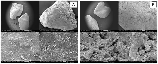 Morphological characteristics were initially used to investigate the physical properties of materials. The morphology of prepared materials is illustrated in Figure 1. Similar to other studies [], PA-1 (washed with deionized water) had rough surfaces. However, the particle morphology of HCl modification (PA-2) was different from PA-1, leading to an irregular surface and porosity. The shape and appearance showed a rough surface and higher porosity than PA-1 due to HCl modification, which could be used to remove surface impurities and enhance the physical properties of materials. Therefore, fluoride adsorption into the pore spaces increased after the materials were acid-modified [].