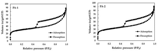 The porosity and surface area of both PAs were investigated by the nitrogen adsorption isotherm (Figure 2 and Table 3) via the BET and BJH methods, respectively. The calculated BET surface areas of PA-1 (washed with DI water) and PA-2 (washed with acid) were 111.48 and 108.93 m2/g, respectively. The pore sizes of PA-1 and PA-2 materials, measured by Barret–Joyner–Halenda (BJH) methods, were 3.65 and 4.62 nm, respectively. PA-2 had larger pores than PA-1 because it had been activated with an acid solution to improve its porous properties. In addition, the pore volumes of PA-1 and PA-2 were 0.112 and 0.107 cc/g, respectively. The pore volume of both adsorbents showed a small reduction in PA-2 compared with PA-1, which indicated the possession of PA-1 by residual HCl molecules. Furthermore, the hysteresis loops of PA-1 and PA-2 represent mesopore adsorbents with pore sizes ranging from 2 to 50 nm. The zeta potentials of PA-1 and PA-2 at varying ranges of pH are shown in Figure S2 in the supplementary materials. At the point of zero charge (pHpzc), the pH of both materials was approximately 4.00.