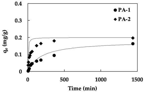The adsorption kinetics experiments were conducted by mixing 1.5 g of the PAs into 100 mL of synthetic groundwater at pH 7.0 (controlled by a phosphate buffer). These samples were mixed by a rotary shaker (GFL, Orbital shaker 3017, Greater Hanover, Germany) at 200 rpm at 25 °C. The mixing was stopped at different adsorption times ranging from 0 to 24 h, and PA-1 and PA-2 were separated from the solution by using a nylon syringe filter (dia. 13 mm, nominal pore size 0.45 µm, Chrom Tech). The filtrates were analyzed for residual fluoride concentration by using the colorimetric method at a wavelength of 570 nm (Jenway 6400 Spectrophotometer, Jenway, London, UK).