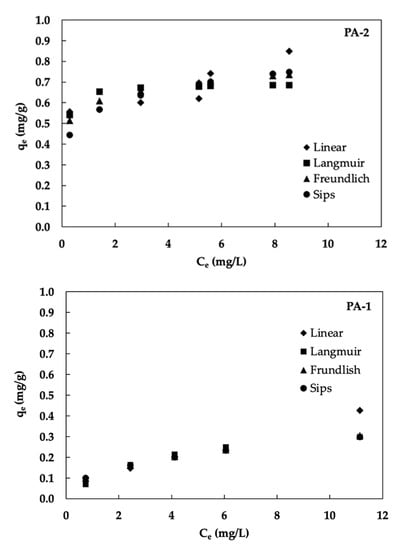 Adsorption isotherm of fluoride on PA-1 and PA-2 (pH 7, solid/liquid ratio 15 g/L, temperature 25 °C, and vertical shaker at 200 rpm at equilibrium time).