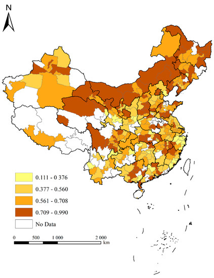 In the context of global warming, SU and precipitation showed an increasing trend: the change slopes were 0.178 and 18.007, respectively, whereas FD showed a decreasing trend in China from 2009 to 2017: its change slope was −0.589. The values of SU fluctuated between 41 and 50. Among them, SU in 2013 was the largest, and about 14% of the days in a year belonged to extremely high temperature conditions. The values of FD fluctuated between 31 and 40, and about 11% of the days in a year belonged to extremely low temperature conditions. There were ten more summer days than frost days on the whole, and the gap between the two will become larger and larger in the context of global warming. In addition, the mean value of precipitation was 977.009 mm, precipitation in 2011 was the lowest with a value of 823.257 mm, and precipitation in 2016 was the largest with a value of 1139.313 mm, indicating that the precipitation values did not change significantly from 2009 to 2017 (Note: The survey period for natural amenity used in this article started in 2009, which is earlier than the micro data survey of the elderly migrants. There are two main reasons for this: first, the earliest survey data of the CMDS was in 2009, but the maximum age of the surveyed individuals in this database was 60 years old, so this article started from the available data in 2015. Second, there was a certain lag in the effect of air pollution control, and the time effect of natural amenity can be seen more clearly by adding the data of the previous years).