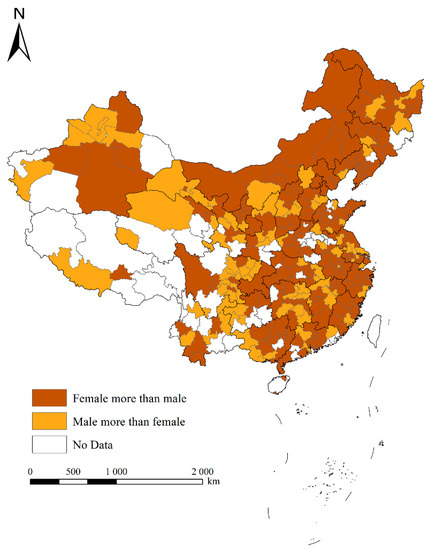The index of air quality was measured by the concentration of PM2.5 (in μg/m3), and the data mainly came from NASA’s Global Annual PM2.5 Grids data from 2009 to 2017, with the spatial resolution of 0.01° × 0.01°. We used ArcGIS 10.5 (Environmental Systems Research Institute, Inc., Redlands, CA, USA) and Python 3.6 (Python Software Foundation, Amsterdam, The Netherland) to match annual raster data to each city. The observed daily temperature (including daily maximum temperature and daily minimum temperature), and the daily precipitation data of 822 meteorological stations, were derived from the China Meteorological Data Service Center from 2009 to 2017 (http://data.cma.com, accessed on 21 August 2020). We used the Kriging interpolation method to interpolate the station data to the raster data, with a spatial resolution of 0.01° × 0.01°, and then ArcGIS and Python were used to match each year’s raster data to each city. Finally, based on the city index, this study matched the natural amenity data of each city with the microdata of the elderly migrants. The original samples including all migrants in 2015, 2016, and 2017 were 206,000, 169,000, and 169,989, respectively. After removing the default values and the invalid samples, there were 15,515 elderly migrants in the total sample, of which 6388 individuals were male and 9127 individuals were female.