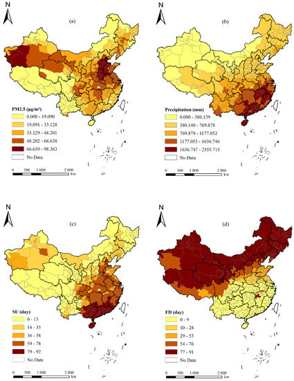 The spatial patterns of PM2.5 (μg/m3) (a), precipitation (mm) (b), number of frost days (day) (c), and number of summer days (day) from 2009 to 2017 (d).