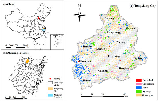 Location of the study area: (a) The location of Tongxiang City in China. (b) The location of Tongxiang City in Zhejiang Province. (c) The development of NGP in Tongxiang City in 2019.