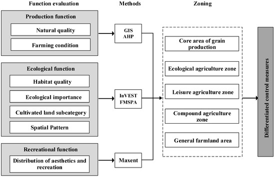 The research framework for delineating the different zones of cultivated land for NGP in the Tongxiang region is described below (Figure 2) (1) Multiple models and indicators were used to evaluate the cultivated land from the perspective of production, ecological, and recreational functions. (2) Five different zones were delineated based on the spatial overlay and connectivity analyses. (3) Differentiated measures for controlling and managing NGP were proposed for each zone. Details of the evaluation of different functions follow.