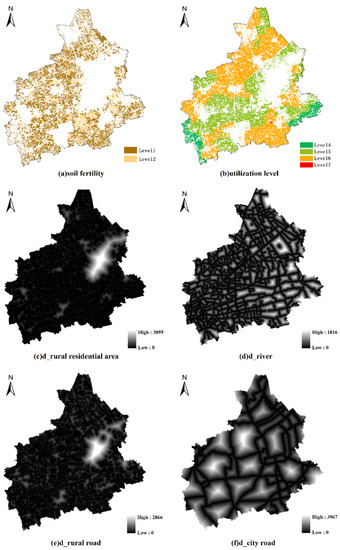 Map of cultivated land condition factors in Tongxiang city: (a) soil fertility; (b) utilization level of cultivated land; (c) distance to rural residential area; (d) distance to river; (e) distance to rural road; (f) distance to city road.