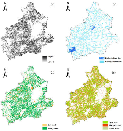 Ecological function evaluation factors of cultivated land in Tongxiang City: (a) habitat quality; (b) ecological importance; (c) cultivated land subcategory; (d) spatial pattern of cultivated land.