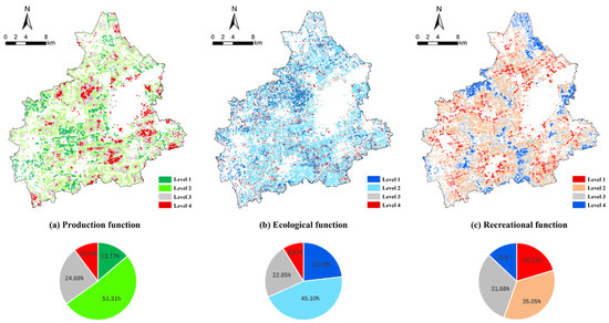 Evaluation of different functions of Tongxiang City; (a–c) represent production function, ecological function, and recreational function, respectively.