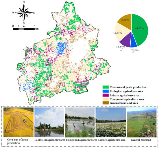 Multifunctional comprehensive zoning was conducted based on natural breakpoint method and spatial overlay analysis through GIS. According to the evaluation results of multi-functions, natural breakpoint method was used to divide all the land patches into several levels. The first-level areas of production, ecological and recreational function evaluation were regarded as the core area of grain production, ecological agriculture area, and leisure agriculture area respectively. The remaining areas within the basic farmland were delimited as compound agriculture area, and those outside the basic farmland were delimited as general farmland areas. The core area of grain production is the largest zone, with an area of 12,878.51 hectares, and accounts for 44.15% of the total cultivated land area (Figure 6). The other zones, including ecological agriculture areas, leisure agriculture areas, compound agriculture areas, and general farmland areas, account for 2089.74, 3571.67, 5729.13, and 4899.53 hectares, respectively.