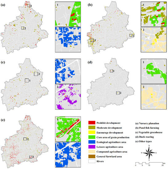 The prohibitive development region of nursery plantations was mainly concentrated in the northern part of Tongxiang, Wuzhen town, where there is plenty a large core area of grain production. Since all types of NGPs should be prohibited in this zone, the land parcels that have been converted to nursery plantations must be restored to grain production in the future. In contrast, nursery plantations were encouraged to develop in ecological agriculture areas (Figure 7a). Pond fish farming is the most numerous NGP type in Tongxiang city and is mainly distributed in the southwestern part of Zhouquan town and Dama town. Pond fish farming was encouraged to develop in compound agriculture areas but prohibited in the core area of grain production and ecological agriculture areas (Figure 7b), which is the same for duck rearing (Figure 7d). Vegetable greenhouses were prohibited from developing in the core area of grain production and ecological agriculture area but encouraged in the leisure agriculture area (Figure 7c). Other types mainly refer to unused land within cultivated land and land parcels used for roadside greening. Most of these land parcels could be restored to grain production in the future.
