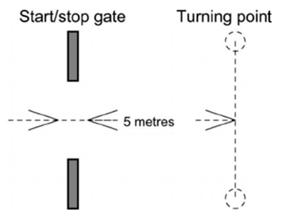 A 10 m sprint test with a 180° COD was performed (Figure 2). Each player sprinted from the start/finish line, completely crossed the 5 m line with either the right or left foot, and turned 180° to sprint back to the start/finish line. Players started with the front foot 0.5 m before the starting line. The photoelectric cells were raised on tripods to 0.75 m above the ground and stood 1.5 m apart. This test was performed 3 times with 2 min of passive recovery between repetitions, and the best time was recorded. The variables used in the analyses were 180CODL and 180CODR. ICC was 0.78–0.85, and CV was 1.4–2.1%.