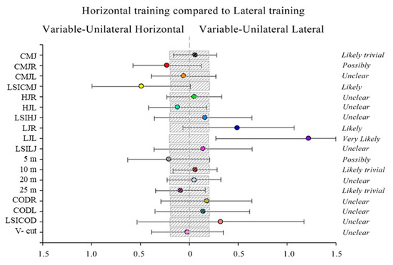 Efficiency of variable unilateral horizontal training (VUH) compared to that of the variable unilateral lateral (VUL) training program to improve bilateral countermovement jump performance (CMJ), vertical jump with the right (CMJR) and left leg (CMJJL), the between-legs asymmetry in vertical jumping (LSICMJ), horizontal jump with the right (HJR) and left leg (HJL), the between-legs asymmetry in horizontal jumping (LSIHJ), lateral jump with the right (LJR) and left leg (LJL), the between-legs asymmetry in lateral jumping (LSILJ), 5, 10, 20 and 25 m linear sprint time, a sprint of 10 m (5 + 5 m) with the right (CODR) and left leg (CODL) with a change of direction of 180°, the between-legs asymmetry in 180° change of direction (LSICOD) and a 25 m sprint with 4 changes of direction of 45° (V-cut) (the bars indicate uncertainty in the true mean changes with 90% confidence limits). Trivial areas were the smallest worthwhile change (SWC) (see Section 2).