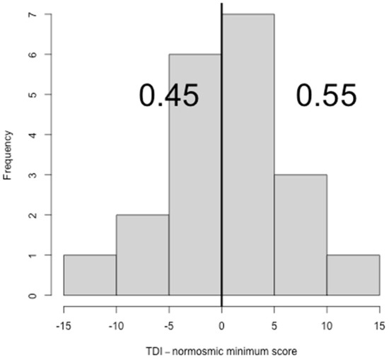 Histogram showing the difference between TDI scores and the normosmic minimum TDI score. TDI (threshold + discrimination + identification).