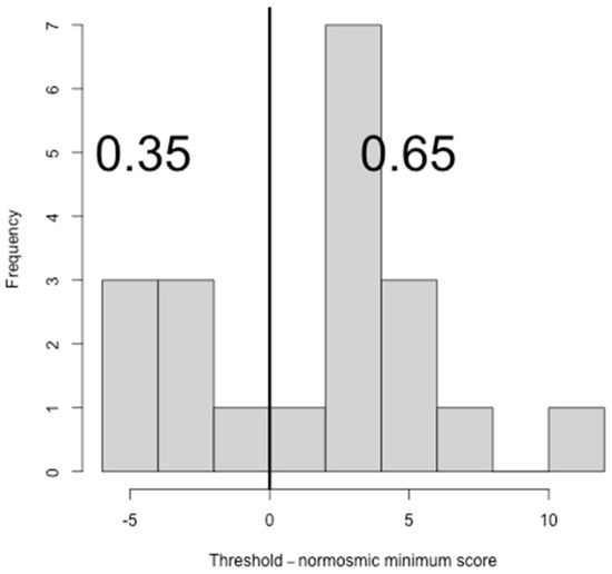 Histogram showing the difference between threshold (T) scores and the normosmic minimum threshold score.