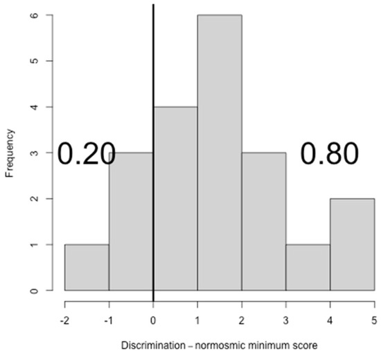 Histogram showing the difference between discrimination (D) scores and the normosmic minimum discrimination score.