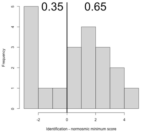 Histogram showing the difference between identification (I) scores and the normosmic minimum identification score.