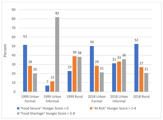 Food insecurity as indicated by hunger was measured using the Community Childhood Hunger Identification Project (CCHIP) questionnaire [5] in both 1999 and 2018. This questionnaire measures household, child, and individual level food security. Altogether, there are eight questions in the scale. If any of these are affirmative, then a score of one is given. A total score of 5–8 indicates that a food shortage (food insecurity) is present in the household. A score of 1–4 indicates that the household is at risk of hunger (poor food security) and a score of zero indicates that the household is food secure. These scores were used to calculate an association with selected dietary and anthropometric variables.