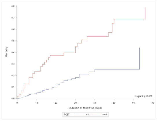 This study created the Kaplan–Meier curves to compare mortality in patients with PCST scores < 4 and ≥4. A Cox proportional hazards model was used to estimate the association between the PCST score and mortality after adjusting for potential confounders. A variable with p < 0.05 was defined as a significant factor associated with mortality in the multivariate analysis. Adjusted hazard ratios (AHRs) with 95% confidence intervals (CIs) were reported to indicate the direction and strength of associations. All data management and analyses were performed using SAS software (version 9.4; SAS Institute, Cary, NC, USA).