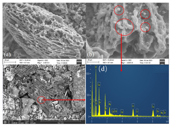 Shown in Figure 2b,c are β-CD-BC adsorbing HMs. It can be seen that there is no obvious change in the surface structure of BC adsorbed with HMs at different scales. As shown in the Figure 2d EDS analysis, the effect of β-CD-BC adsorbing HMs is obvious, and there are a large number of heavy metals on the surface of β-CD-BC. It can be considered that the β-CD did not agglomerate in a large amount, and the modification was relatively successful. Meanwhile, after β-CD functionalization BC lost its well-aligned structure, and a wealth of white substances appeared and covered the surface and pores of BC [20].