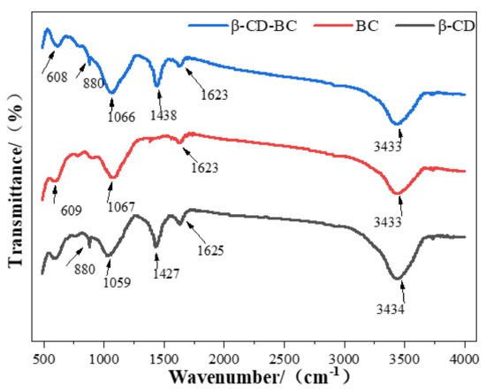 Figure 3 shows FTIR spectra that were created for evaluating the functional groups of β-CD, BC, and β-CD-BC. The influential band for −OH stretching in alkyl or aryl at 3434 cm−1, the bands at around 1631, 1030 cm−1 of BC can be assigned to the C-O stretching or O-H banding, and the band is identified for −CH at 608 cm−1. Additionally, β-CD-BC has similar analogous functional groups. The new bands at 1630 and 1460 cm−1 represent the COO- and CeN, respectively. Moreover, in comparison with pristine β-CD, the new band at around 608 cm−1 of BC could be indorsed to COO- stretching vibration. It could also be observed in β-CD-BC [21], confirming the introduction of the carboxyl groups onto the modified adsorbent. All the results proved that the BC had been successfully functionalized by β-CD [22].